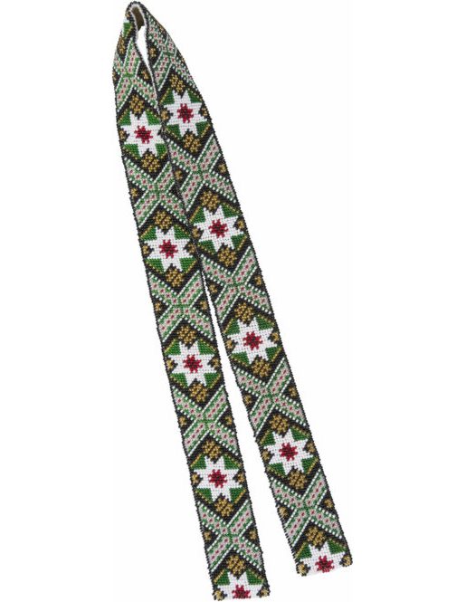 Handbrodert, perletredd belte. Her fins det fleire motiv å velge mellom.